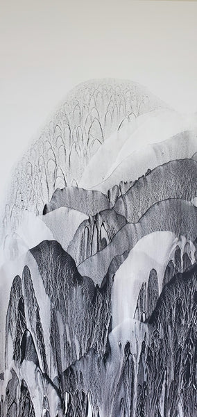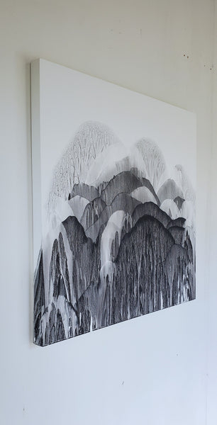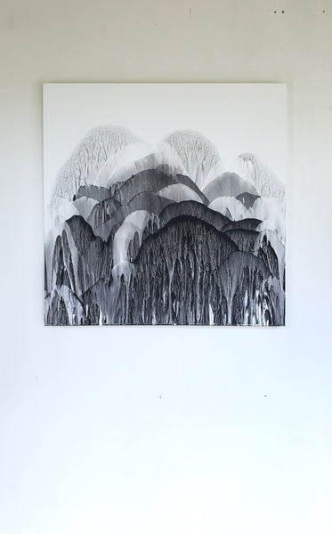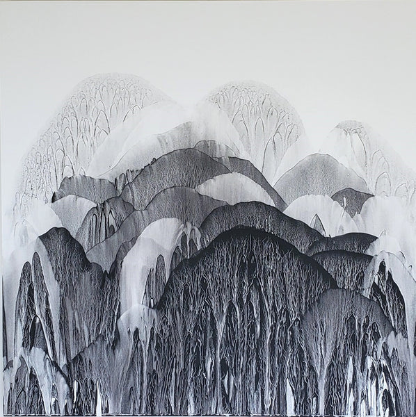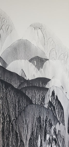 The powdered black iron oxide used in my black ceramic glaze is also used to create my paintings. I mix the iron with water in a variety of dilutions from mostly water to an almost paste-like quality. I paint by pouring the iron onto wood panel that has been primed, sanded and prepped with absorbent ground. During the process, I am responding to the shapes, horizon lines, and sedimentary lines that naturally form, much like fractals, branches of a tree, or a root structure. The painting must stay wet while I work in layers and is sprayed with varnish before an isolation coat of acrylic medium is applied. They are finished with a matte UV protectant varnish. The paintings are textured and tactile and explore similar form, edge, and three-dimensionality as in my ceramic work. I am drawn to a sense of timelessness, the origin story of a stone, a glacier, or cracked desert earth - something that roots us in our existence beyond what humans have constructed.