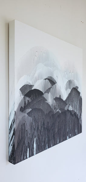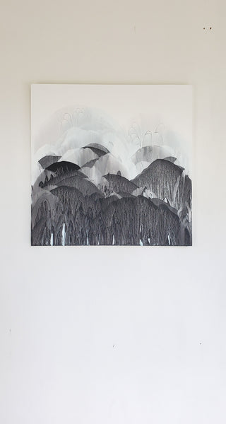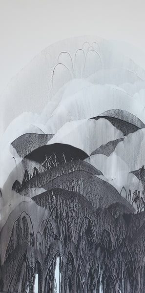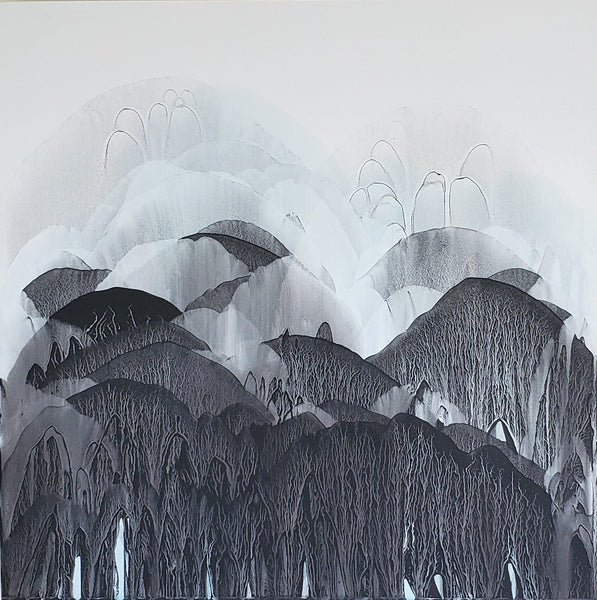 The new Black + Blue paintings have the same rich texture, branch-like sedimentary effect and multiple-depth quality as my previous Black Iron paintings, but the initial application of light blue acrylic adds an atmosphere reminiscent of water, glacier or fog.