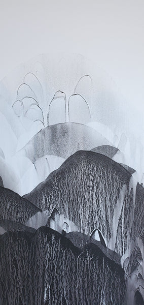 The powdered black iron oxide used in my black ceramic glaze is also used to create my paintings. I mix the iron with water in a variety of dilutions from mostly water to an almost paste-like quality. I paint by pouring the iron onto wood panel that has been primed, sanded and prepped with absorbent ground. During the process, I am responding to the shapes, horizon lines, and sedimentary lines that naturally form, much like fractals, branches of a tree, or a root structure. The painting must stay wet while I work in layers and is sprayed with varnish before an isolation coat of acrylic medium is applied. They are finished with a matte UV protectant varnish. The paintings are textured and tactile and explore similar form, edge, and three-dimensionality as in my ceramic work. I am drawn to a sense of timelessness, the origin story of a stone, a glacier, or cracked desert earth - something that roots us in our existence beyond what humans have constructed.