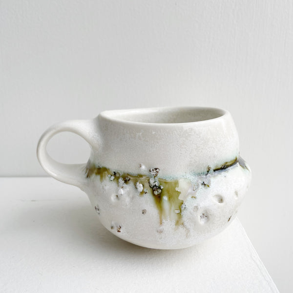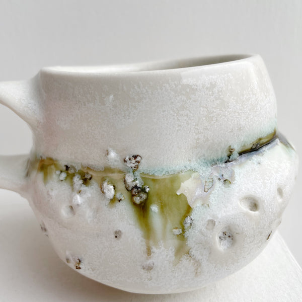 Porcelain in white glaze with painted bronze, crushed granite texture.
