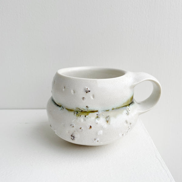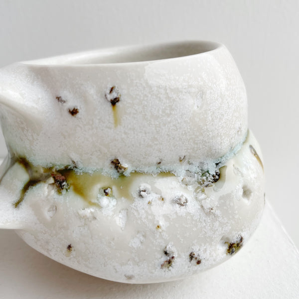 Porcelain in white glaze with painted bronze, crushed granite texture.