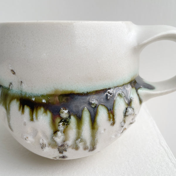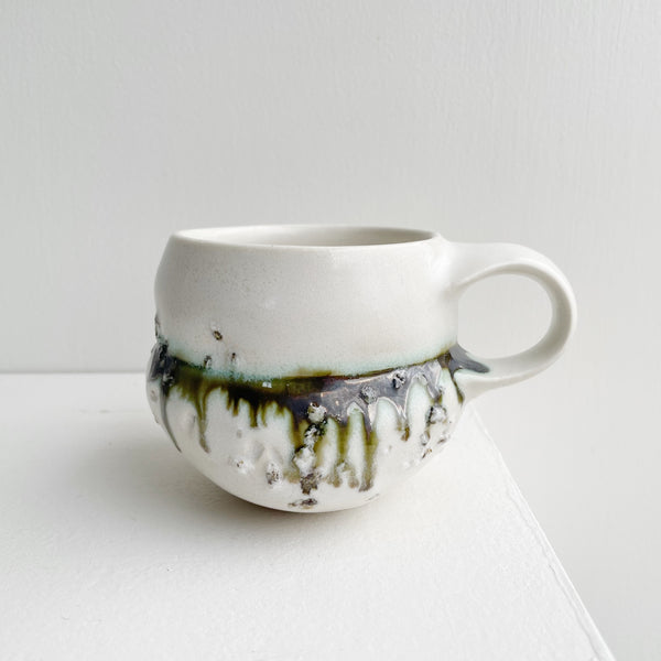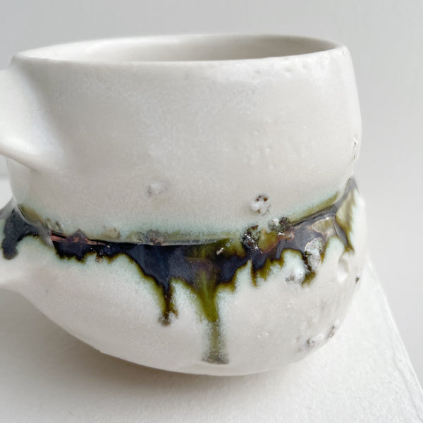 Porcelain in white glaze with painted bronze, crushed granite texture.