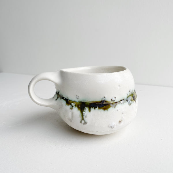 Porcelain in white glaze with painted bronze, crushed granite texture.