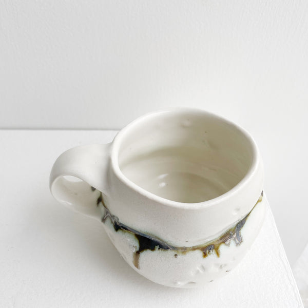 Porcelain in white glaze with painted bronze, crushed granite texture.