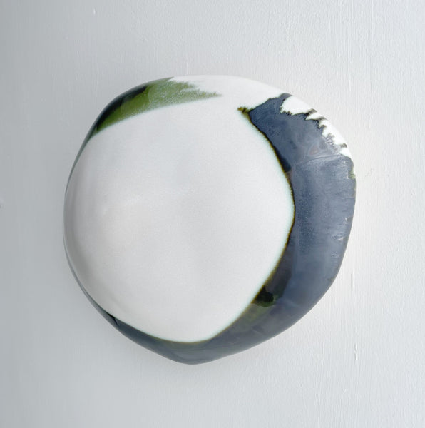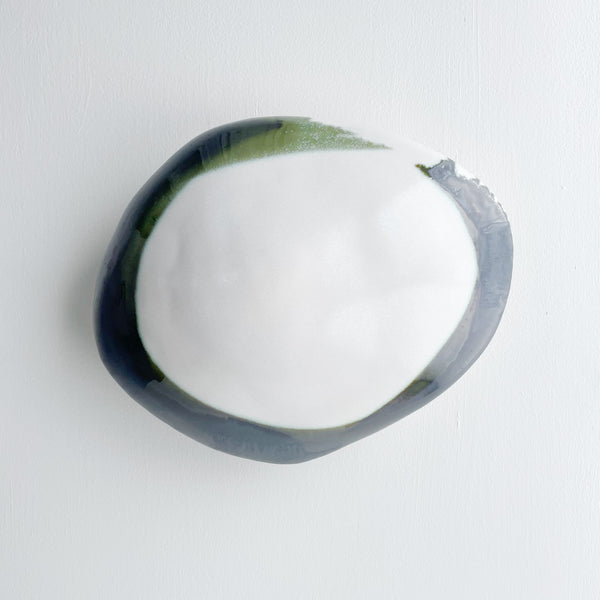 Slip cast porcelain or stoneware (hollow, pillow-like form), some with white satin glaze and bronze copper halo, some fully covered by bronze glaze, one with full matte white glaze.
