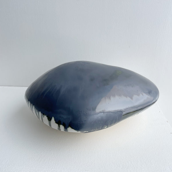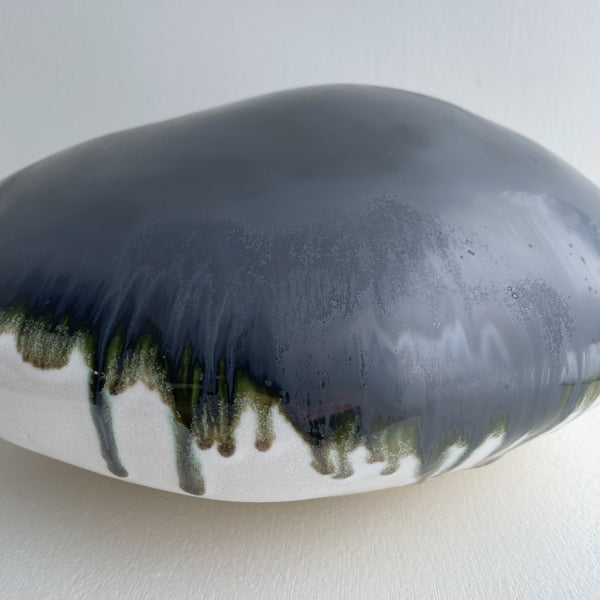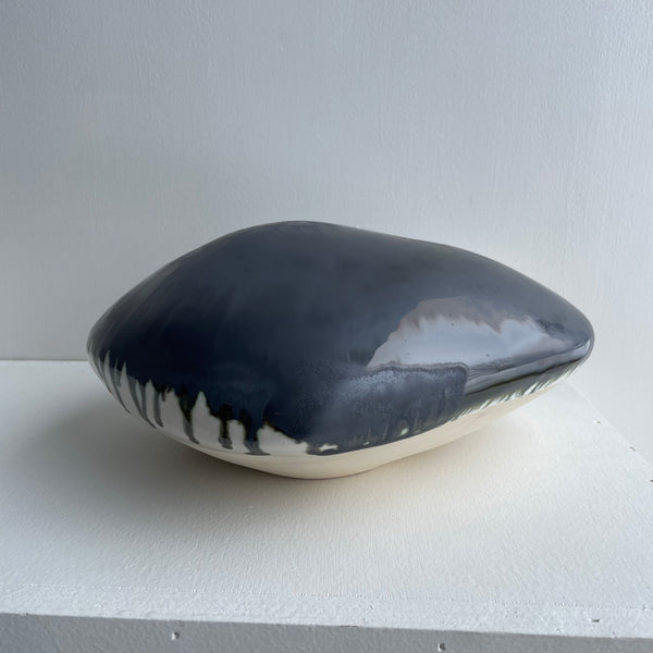 Slip cast porcelain or stoneware (hollow, pillow-like form), some with white satin glaze and bronze copper halo, some fully covered by bronze glaze, one with full matte white glaze.