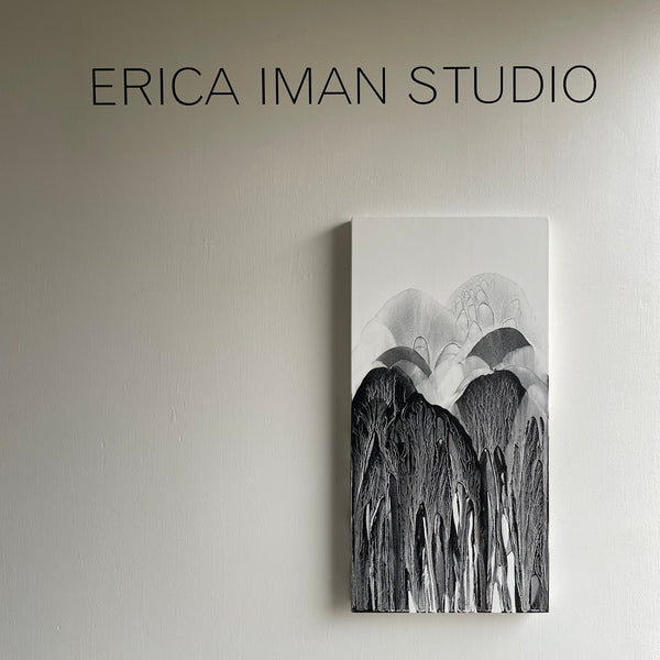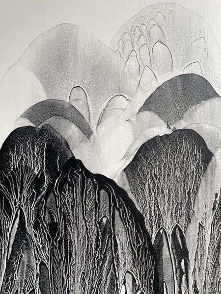 The powdered black iron oxide used in my black ceramic glaze is also used to create my paintings. I mix the iron with water in a variety of dilutions from mostly water to an almost paste-like quality. I paint by pouring the iron onto wood panel that has been primed, sanded and prepped with absorbent ground. During the process, I am responding to the shapes, horizon lines, and sedimentary lines that naturally form, much like fractals, branches of a tree, or a root structure. The painting must stay wet while I work in layers and is sprayed with varnish before an isolation coat of acrylic medium is applied. They are finished with a matte UV protectant varnish. The paintings are textured and tactile and explore similar form, edge, and three-dimensionality as in my ceramic work. I am drawn to a sense of timelessness, the origin story of a stone, a glacier, or cracked desert earth - something that roots us in our existence beyond what humans have constructed.